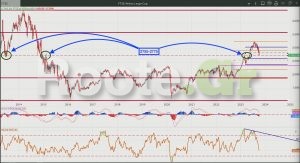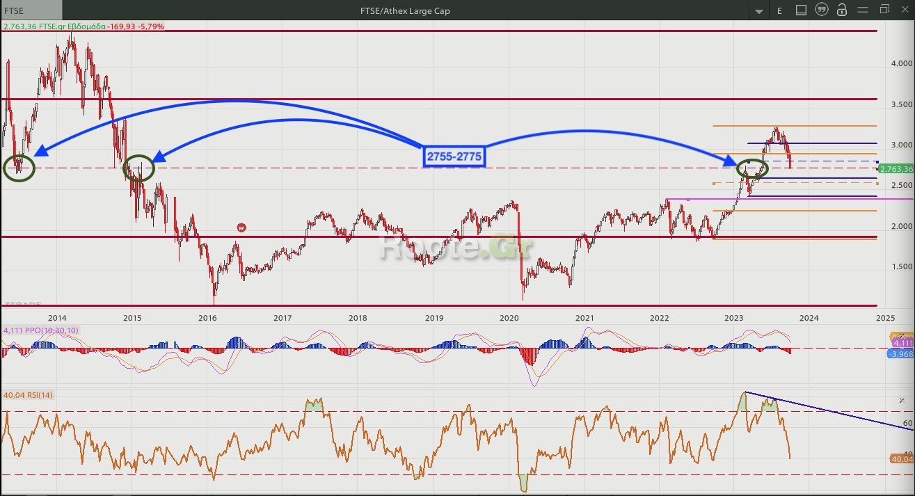 Είχαμε άλλη μια αρνητική εβδομάδα (-6%) για τον FTSE και κλείσιμο σχεδόν στο χαμηλό της (2763), σε ενα πολύ καίριο για τη συνέχεια πεδίο τιμών. Είδαμε πως αντέδρασε ο S&P απο το αντίστοιχο σημείο, σύμφωνα με το update που δημοσιεύσαμε και στο Market Esoterica την Παρασκευή. Το δείχνουμε σήμερα στο εβδομαδιαίο διάγραμμα για τον FTSE απο το 2013.