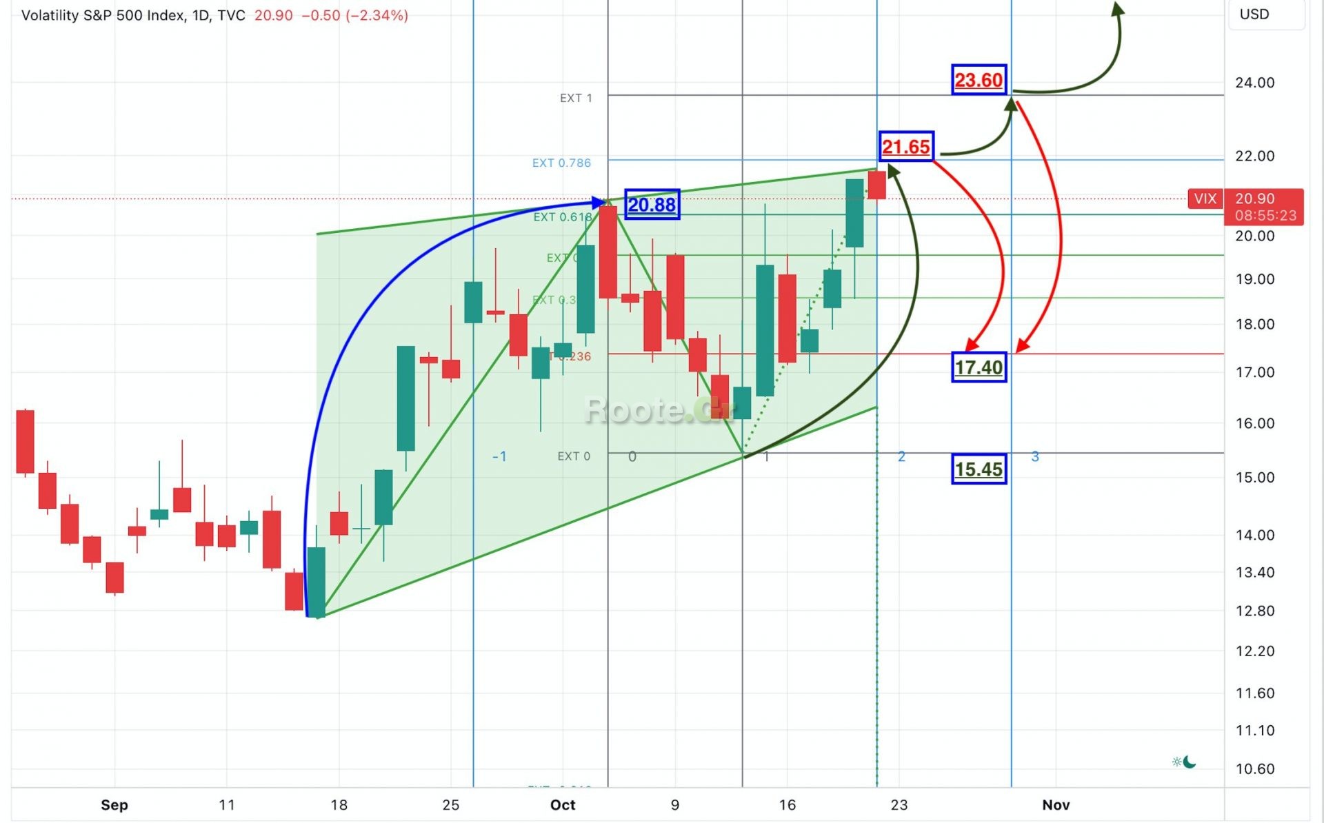 Στο τελευταίο update (εδώ) στις 1/9 προκρίναμε ανοδική κίνηση, καθώς διακρίναμε θετικές αποκλίσεις που μας έδιναν στόχο στο 18 και στο 20. Δώσαμε επίσης σαν σημαντική ημέρα για υψηλό την 4/10. Εκπληκτικής ακρίβειας πρόβλεψη καθώς βλέπουμε υψηλό στις 4/10 στο 20.88! Mic drop.