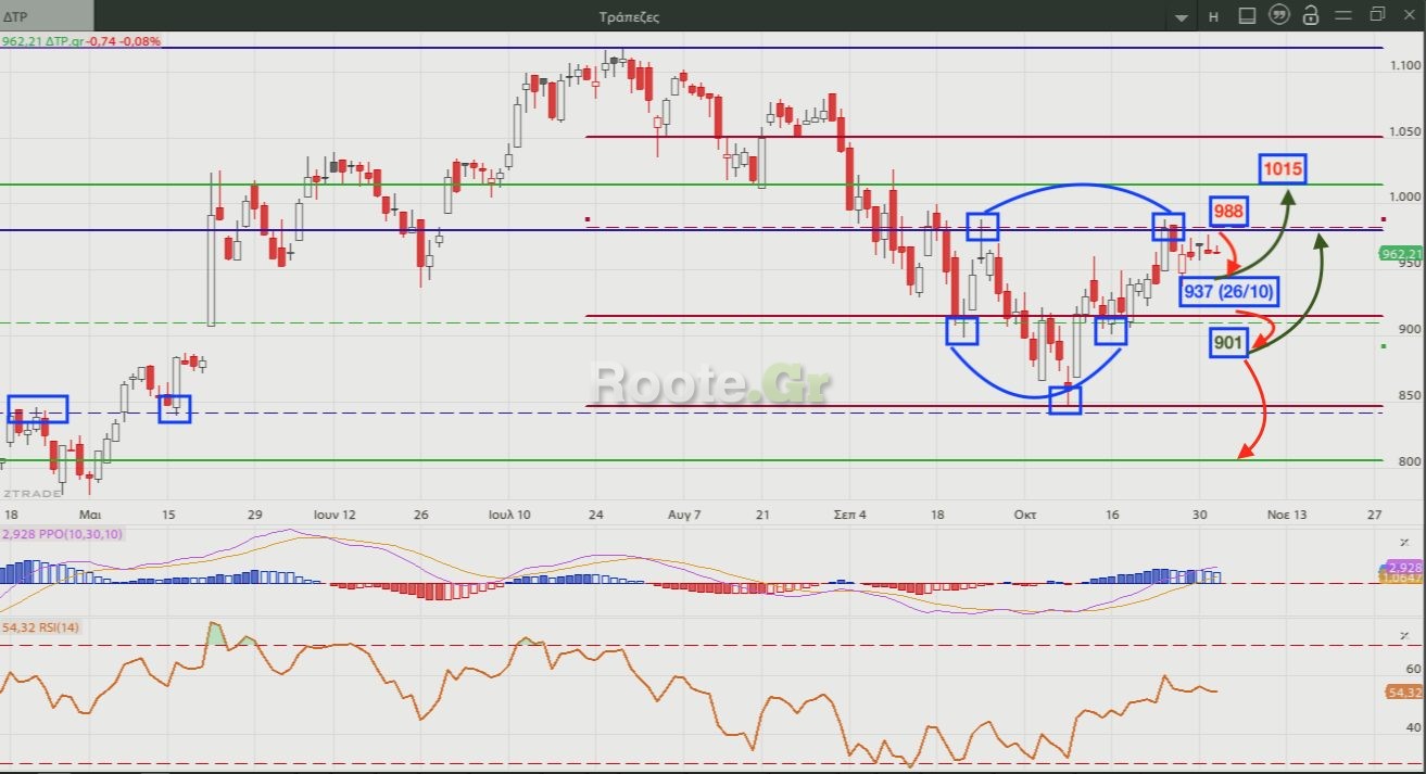 Επιπλέον, είχαμε και εδώ προκρίνει την 26/10 ως turn day και βλέπουμε πως είναι η ημέρα που έκανε το τελευταίο χαμηλό (937). Με αυτό σαν βασική στήριξη και τη ζώνη 900-915 ως βασικό mob, θα μπορούσε να προσεγγίσει την πιο βασική για αυτόν αντίσταση στο 1014.