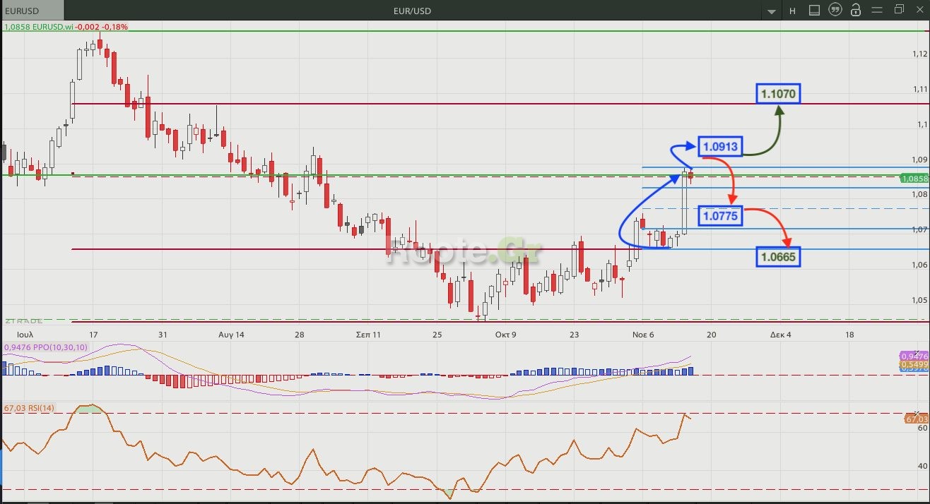 Στο τελευταίο update (εδώ) προκρίναμε ανοδική κίνηση με στόχο 1.0830 και στήριξη στο 1.0575 και επιβεβαίωση με κλεισίματα πάνω απο 1.0665. Είδαμε σε τέσσερις συνεχόμενες μέρες χαμηλά 1.0656-1.0664 και απο εκεί επίτευξη του στόχου χθες με υψηλό στο 1.0889.
