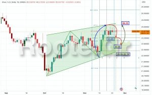 Η διόρθωση αυτή έχει στόχο προς το 23.05, όπου βρίσκεται η βασική μας στήριξη. Απο εκεί ή απο το 22.56 θα πρέπει να ξεκινήσει το νεο ανοδικό κύμα που θα ξεπεράσει το υψηλό της 17/11 (24.15). Δείχνουμε στο διάγραμμα και ενα rising wedge του οποίου η κάτω πλευρά είναι στο 22.27 και θα πρέπει να την έχουμε υπόψη.