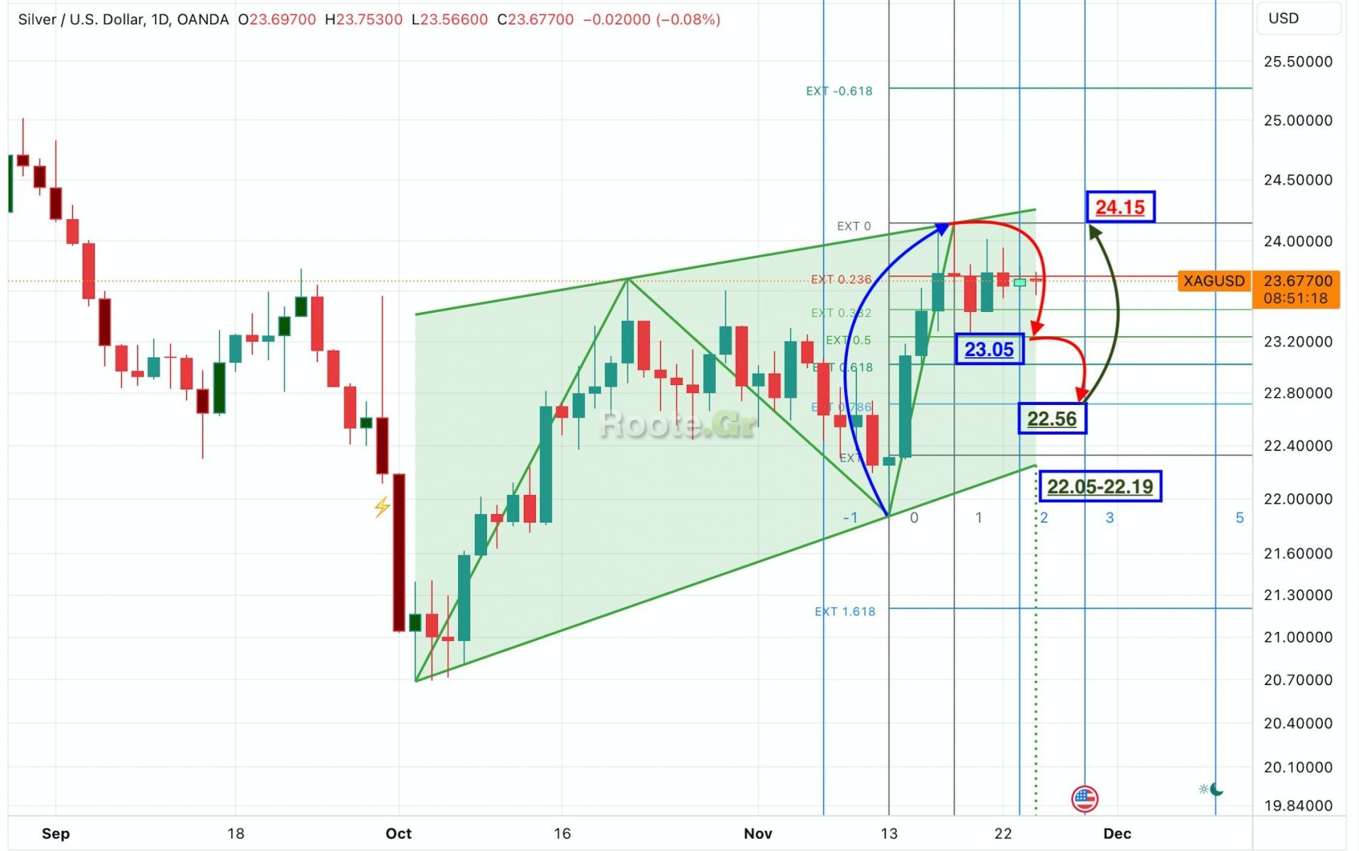 Στο τελευταίο update (εδώ) στις 30/10 προκρίναμε ανοδικούς στόχους με στόχο το 24.50 και πρϋπόθεση τη διατήρηση της ζώνης 22.05-22.19 σε ημερήσια κλεισίματα. Είδαμε χαμηλό στο 21.88 και κλείσιμο στο 22.31 στις 13/11 και απο εκεί υψηλό στο 24.15 στις 17/11. 10%+ στο ασήμι σε λίγες μέρες not bad, σε άλλη μια εξαιρετική εφαρμογή του πλάνου.