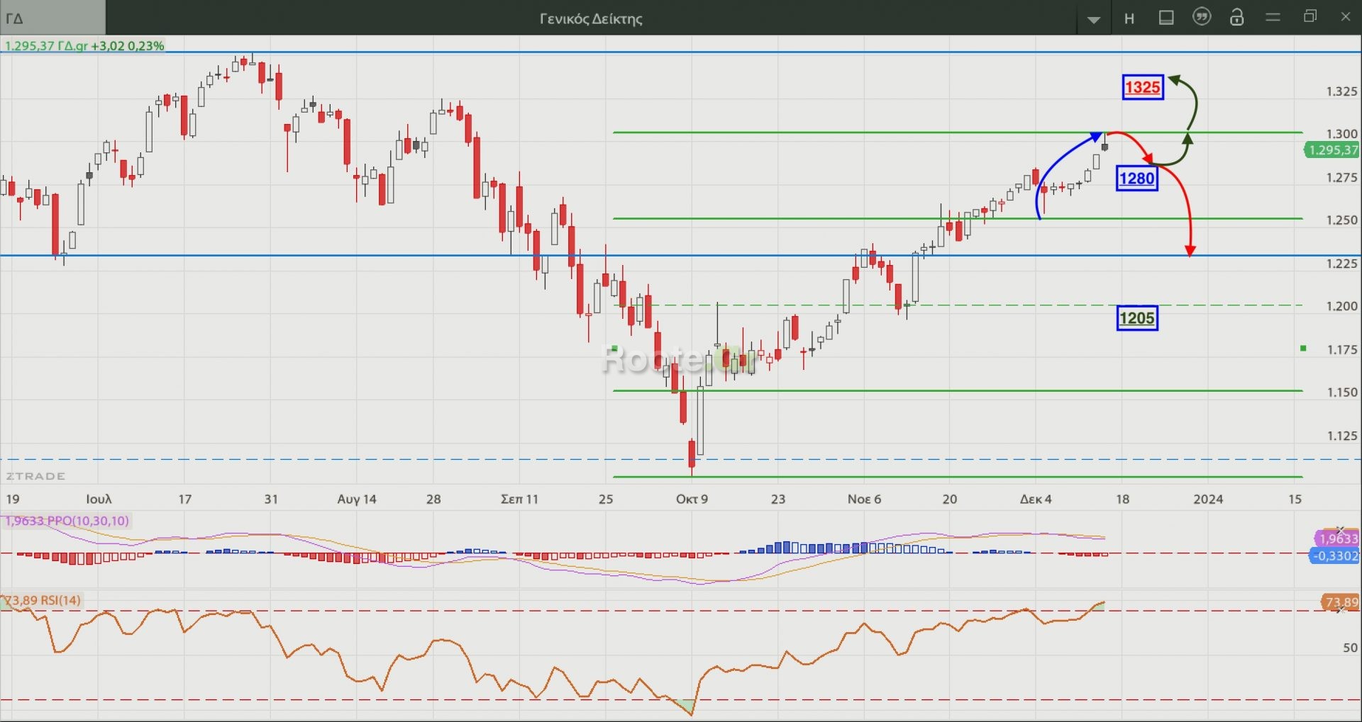 Για να συνεχιστεί λοιπόν απρόσκοπτα η ανοδική προσπάθεια θα πρέπει να μείνει πάνω απο το 1280. Κλεισίματα κάτω απο αυτό -μετά και τη χθεσινή συνεδρίαση- θα αυξήσουν τις πιθανότητες για μεγαλύτερη διόρθωση σε τιμές και χρόνο. Στην πάνω πλευρά κρατάμε το 1325 σε ημερήσια και εβδομαδιαία κλεισίματα, πάνω απο το οποίο ανοίγει διάπλατα ο δρόμος για νεα υψηλά (1385+).