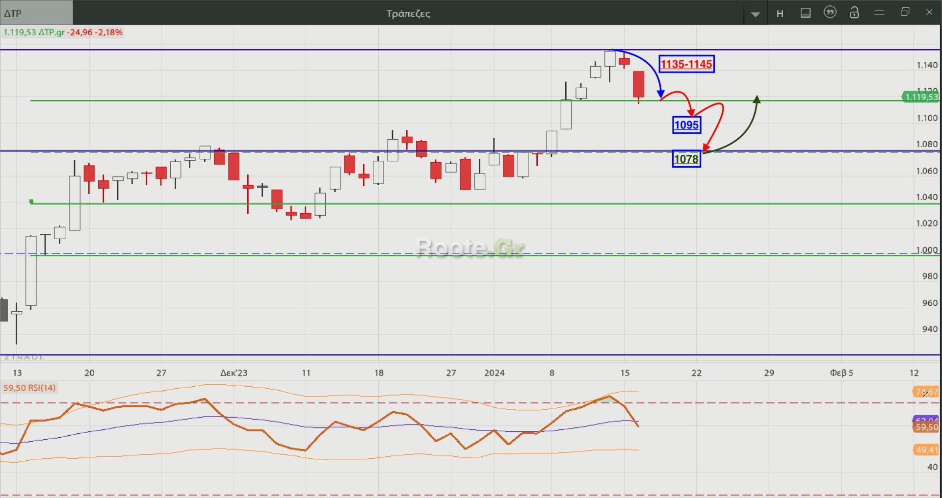 Για τη συνέχεια, θα παραμείνουμε στο πλάνο μας. Πρώτη στήριξη στο 1095 και ο βασικός στόχος της διόρθωσης στο 1078. Όποια ανοδική αντίδραση έχει πλέον όριο το 1135-1145. Λάβαμε χθες αρκετές ερωτήσεις για το μεσοπρόθεσμο mob του ΔΤΡ. Βρίσκεται στο 1001 και καταλαβαίνουμε πως δεν είναι της παρούσης, αλλά απαντούμε εδώ προς κάθε χρήση.