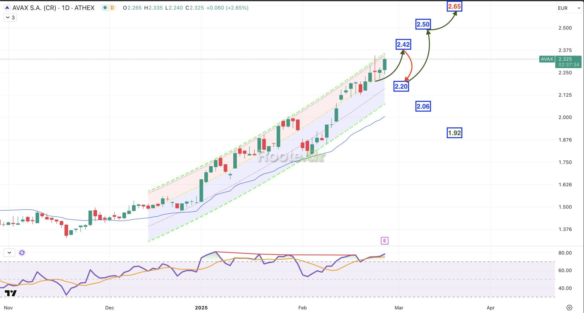 Στο τελευταίο update (εδώ) στις 7/2 προκρίναμε συνέχιση της ανοδικής κίνησης με στήριξη στο 1.82 και στόχο το 2.25. Είδαμε χαμηλό στις 8/2 στο 1.85 και από εκεί ανοδικό σκέλος που έφτασε μέχρι το 2.35 στις 24/2 σε πολύ καλή εφαρμογή του πλάνου.