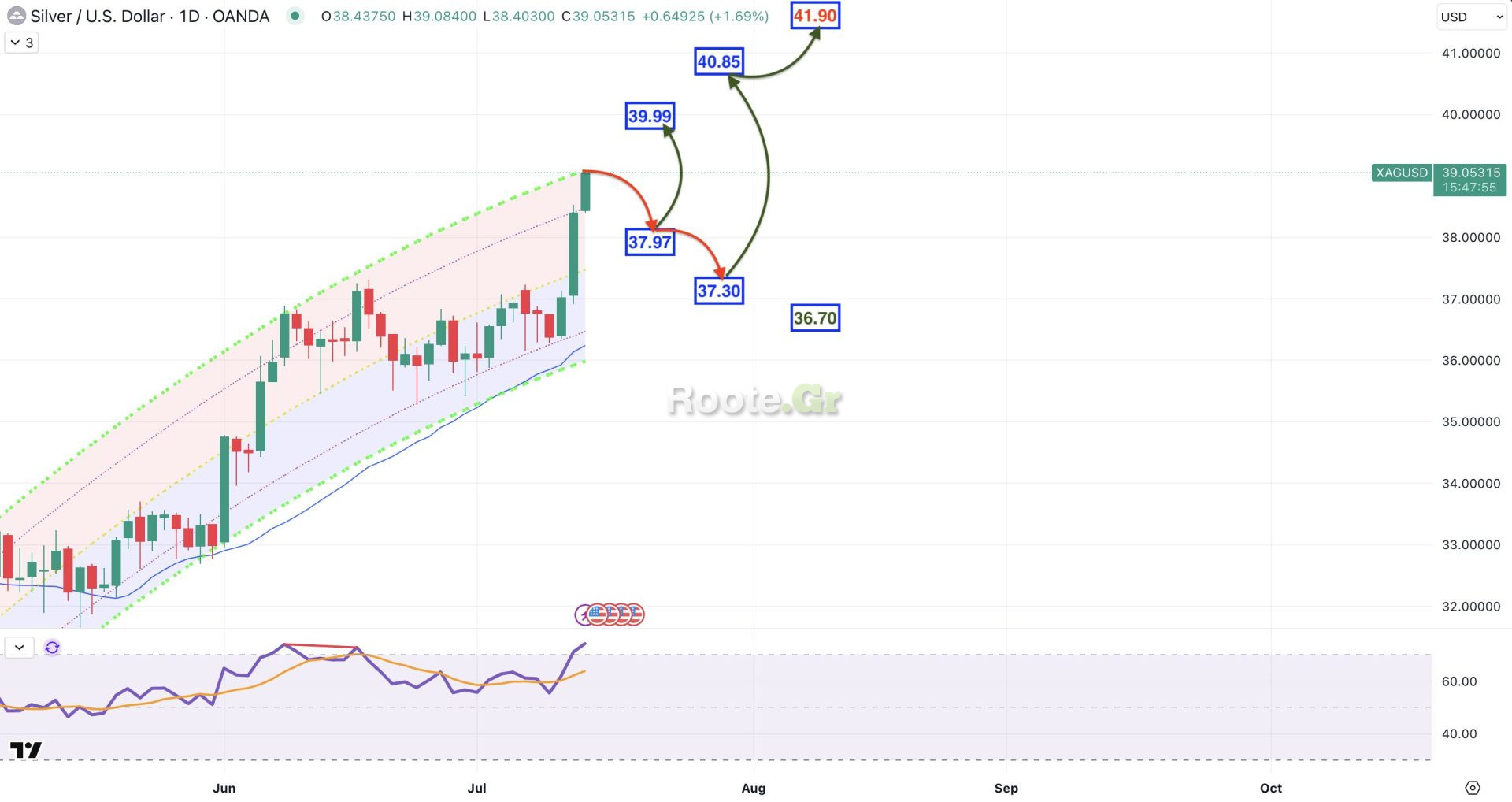 Στο τελευταίο update (εδώ) στις 11/6, προκρίναμε διόρθωση προς τις στηρίξεις στα 35.60 και 34.55 και στη συνέχεια νέο ανοδικό σκέλος με στόχο το 38.98. Είδαμε χαμηλό στο 35.28 στις 23/6 και από εκεί ανοδικό κύμα που ικανοποίησε πλήρως τον στόχο, φτάνοντας σήμερα στο 39.01 — σε εξαιρετική εφαρμογή του πλάνου.