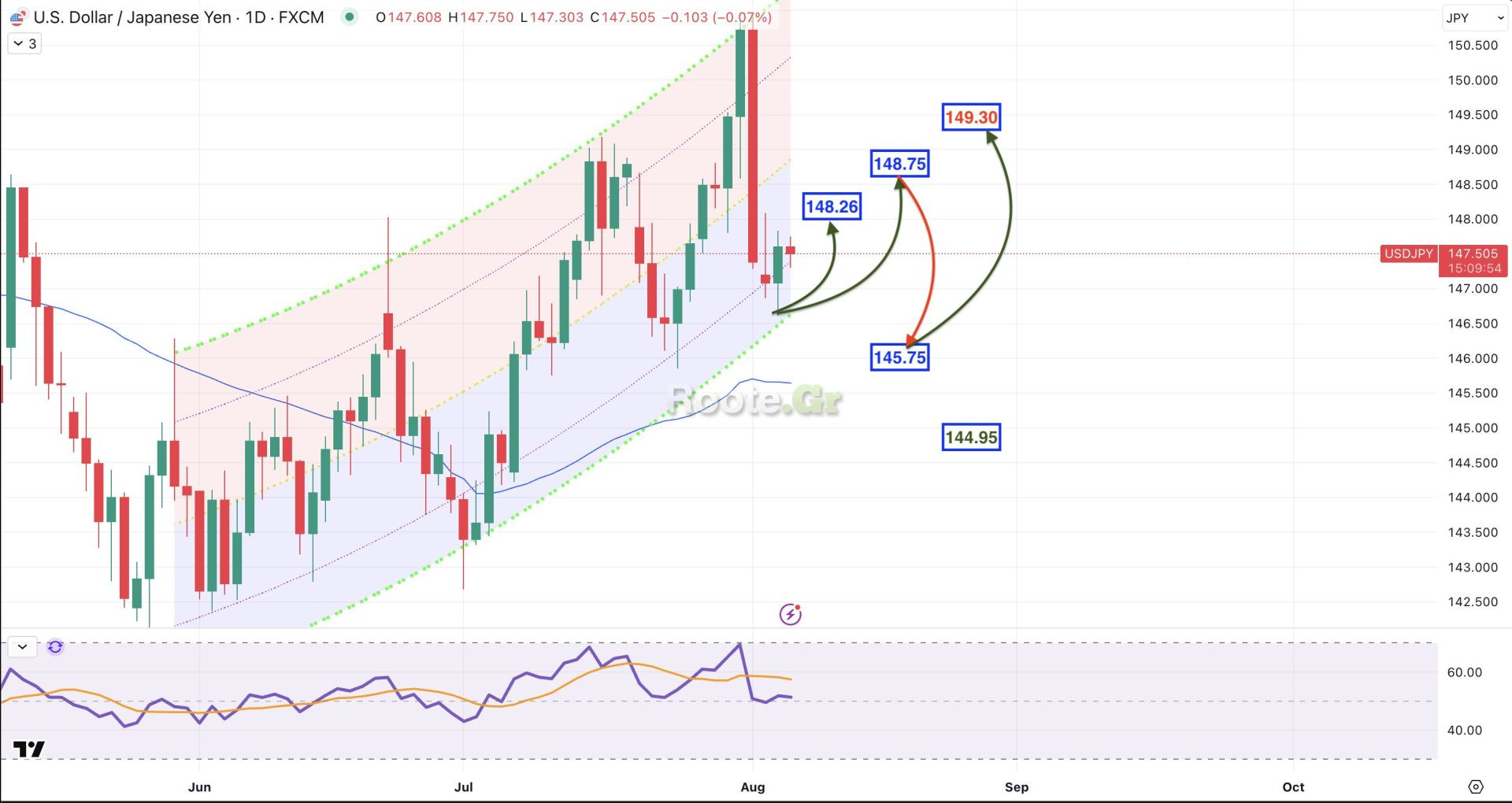 Για τη συνέχεια, είναι πιθανή αντίδραση προς το 148.26 και το 148.75, έτσι ώστε να ακολουθήσει νέο καθοδικό σκέλος με στόχο το 145.75. Μετά την ολοκλήρωση αυτής της ταλάντωσης, αναμένουμε μεγαλύτερη ανοδική κίνηση με επαναπροσέγγιση των αντιστάσεων σε πρώτο στάδιο. Κλεισίματα πάνω από το 149.30 θα ανατρέψουν το καθοδικό momentum, ενώ κάτω από 144.95 θα ανοίξει το δρόμο για χαμηλότερα.
