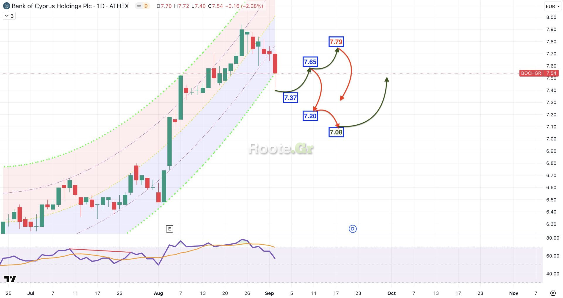 Για τη συνέχεια, είναι πιθανή διόρθωση προς τις στηρίξεις στο 7.37 και το 7.20, ώστε να ξεκινήσει νέα αντίδραση με κοντινό στόχο το 7.65 και βασικό το 7.79. Από εκεί αναμένεται πτωτικό σκέλος που θα μπορούσε να φτάσει μέχρι το 7.08, κλείνοντας την τρέχουσα ταλάντωση και δημιουργώντας τις συνθήκες για νέο ανοδικό κύμα. Κομβική προϋπόθεση για αυτό το σενάριο παραμένει η διατήρηση των τιμών πάνω από το 6.70.