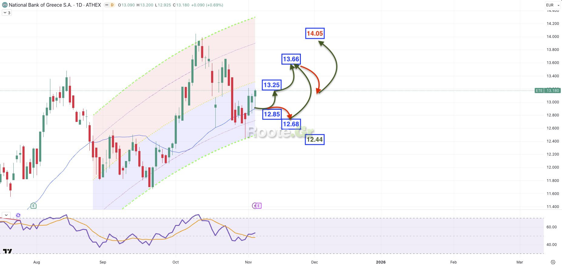 Προϋπόθεση για το σενάριο αυτό αποτελεί η διατήρηση του χαμηλού της 31/10 (12.44), καθώς κλεισίματα κάτω από αυτό θα ανοίξουν τον δρόμο προς χαμηλότερα επίπεδα (11.65).